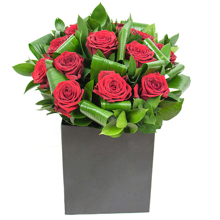 Embrace elegance with our refined red rose bouquet, artfully combined with aspidistra leaves and ruscus. This sophisticated arrangement blends vibrant hues and graceful design, making it an ideal gift or a stunning addition to your living space.