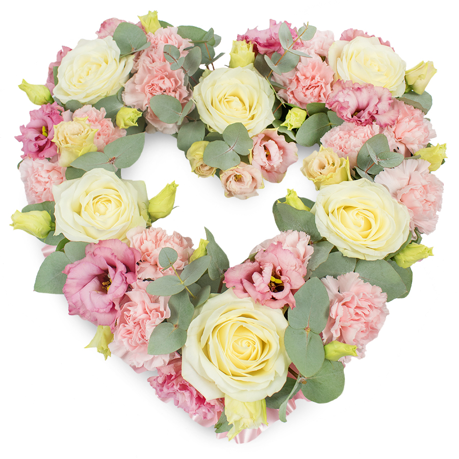 Experience the timeless beauty of our open heart tribute, meticulously crafted to express your deepest sentiments. This unique arrangement features a harmonious blend of elegant white roses, soft pink carnations, delicate pink lisianthus, and lush eucalyptus leaves.Why Choose This Bouquet:
